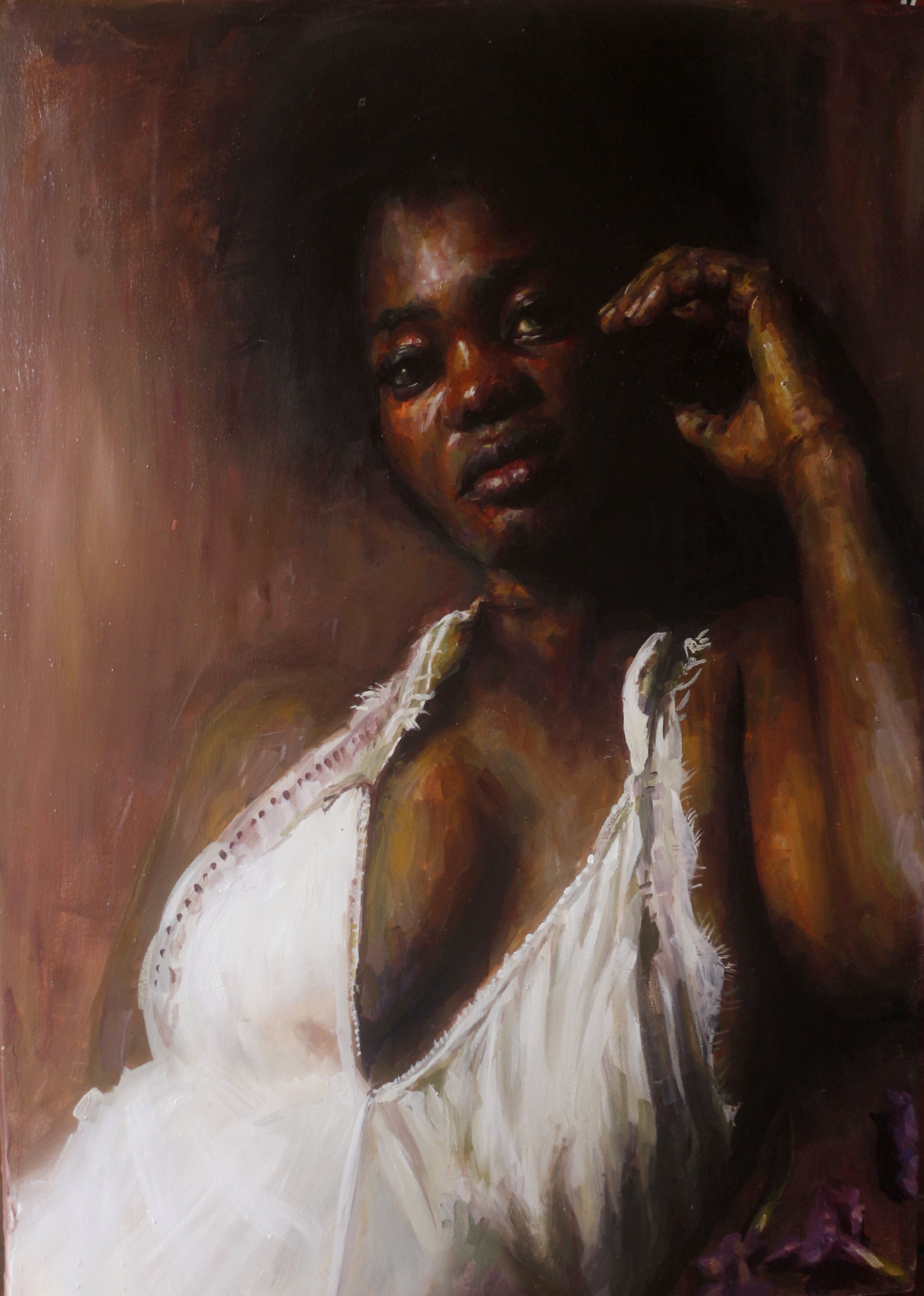 Chidimma Nwafor (b. 1995) is a Nigerian visual artist born in Anambra, Nigeria. Her artistry delves into the societal stereotypes impacting women and the subtle intricacies of human emotion. Through her paintings, characterized by muted and dark color palettes inspired by the Baroque movement, she challenges and questions gender stereotypes and societal expectations. Nwafor holds a Bachelor of Arts degree in Fine Arts from the University of Benin. Currently based in Lagos, Nigeria, she works as a full-time artist, exploring and reflecting upon these themes in her compelling artwork.